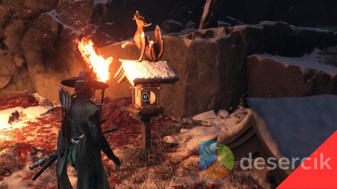 Z pobliskiego kosza weź pochodnię. Użyj jej, aby zapalić tylko te dwa lampiony, które stoją przy posągach lisów, a dwa pozostałe zostaw zgaszone. Jeśli zrobisz to poprawnie, usłyszysz charakterystyczny dźwięk, a wąskie przejście otworzy się, prowadząc cię w głąb kryjówki.