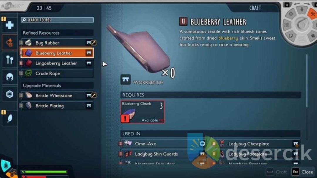 Podstawowym surowcem pozyskiwanym z owoców są Blueberry Chunks. To one stanowią klucz do tworzenia kolejnych przetworzonych materiałów. Najważniejszym z nich jest Blueberry Leather – skóra jagodowa, czyli specjalny, rafinowany zasób, który otwiera drogę do dalszego craftingu.