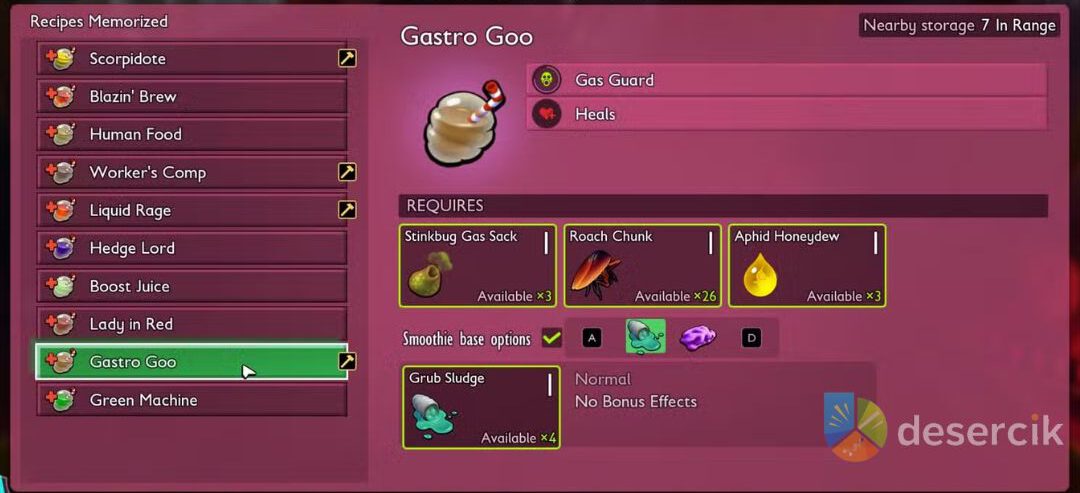 - Proces: W Stacji Smoothie wybierz bazę – Guma Nugget doda modyfikator Sticky, który wydłuży działanie buffa, a Bryja z Larw jest neutralna, bez bonusów. Po zmiksowaniu dostaniesz swoją porcję Gastroo Goo, gotową do użycia.