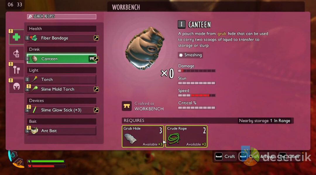 - Materiały: 3 × Skóra Larwy (Grub Hide), 2 × Prymitywna Lina (Crude Rope)