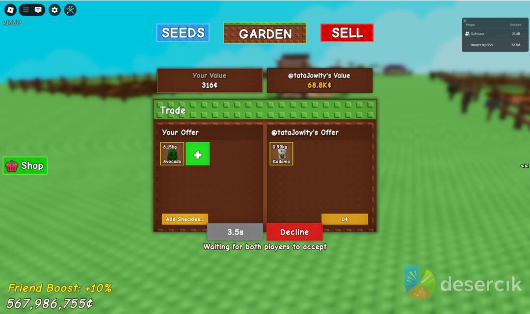 Zanim przejdziemy do szczegółów, zatrzymajmy się na moment, bo system handlu to coś, co wywróciło społeczność do góry nogami. Wcześniej w Grow a Garden mogłeś tylko podarować itemy, co było fajne, ale ograniczone – ot, klikasz „E” w lobby i dajesz kumplowi jabłko na znak przyjaźni. Teraz? Możesz handlować jak na giełdzie w Animal Crossing, wymieniając wszystko, od zwykłych owoców po rzadkie zwierzaki jak Kitsune. Na forach gracze szaleją, dzieląc się historiami o tym, jak wymienili tuzin pomidorów na Mochi Mouse albo jak ktoś próbował ich oszukać, oferując „super rzadkie nasiona”, które okazały się fejkiem. Inspiracją dla tego systemu mogły być inne gry z handlem, jak Roblox czy Stardew Valley, ale twórcy dodali tu swój ogrodniczy twist. Gotowi, by wskoczyć do centrum handlu i zostać królem wymian?