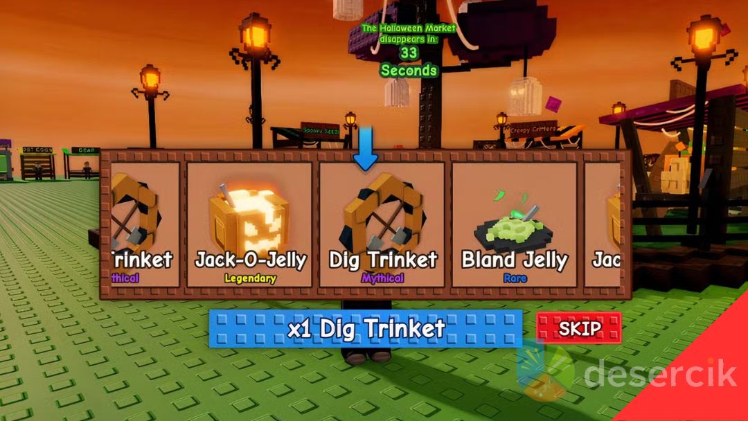 Halloween Market pojawia się co 45 minut, a Gear Box zazwyczaj jest w ofercie, więc warto trzymać przy sobie trochę Candy Corns. Alternatywnie, Dig Trinket można zdobyć w nagrodach z kopania z prawdopodobieństwem 11,63%.