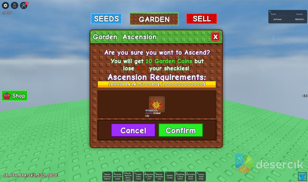 - Jeśli masz wszystko, co potrzeba, kliknij przycisk Potwierdź, i bum – wznosisz się! Ale uwaga: po tym ruchu tracisz wszystkie swoje Szekle, a w zamian dostajesz tylko 10 Monet Ogrodu. To twoja nagroda za odwagę.