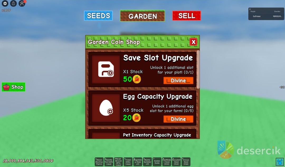 Po spełnieniu tych wymagań i kliknięciu „Potwierdź”, dostajesz 10 Monet Ogrodu. Możesz je wydać na ulepszenia, jak więcej slotów na działki, większy ekwipunek czy boosty do farmienia. Ale czy to warte takiej ceny? O tym za chwilę.