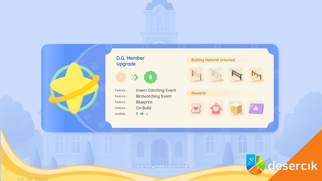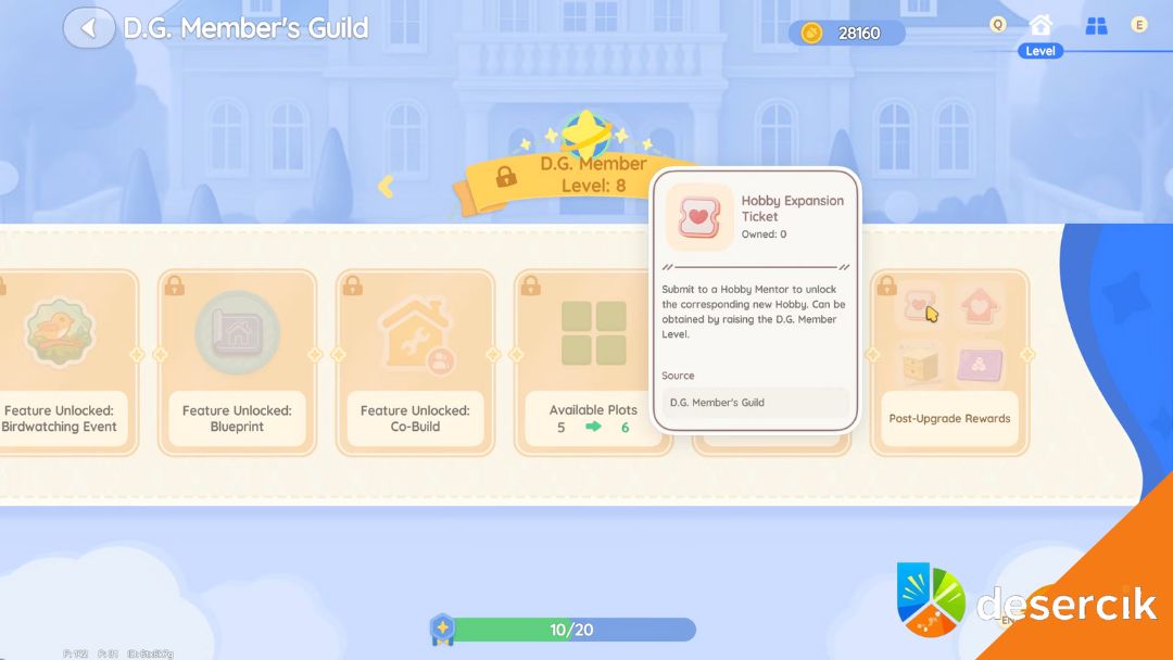 Gildia Twórców, w skrócie DG, otwiera się praktycznie od razu po starcie w Heartopii. Każdy awans w gildii daje dostęp do nowych funkcji, aktywności i właśnie hobby. Na początku nie masz wyboru, które hobby odblokujesz, ale im dalej w grze, tym częściej będziesz mógł decydować samodzielnie, które zajęcie chcesz rozwijać jako pierwsze.