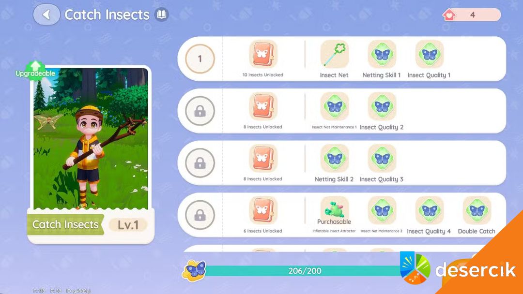 Łapanie owadów w Heartopia to jedno z bardziej relaksujących zajęć, jeśli wybierzesz je jako swoje hobby. Żeby w ogóle móc to robić, musisz odblokować odpowiednią ścieżkę u Naniwy i zdobyć specjalne narzędzie do łapania. Owady chwytasz za pomocą bańki wypuszczanej z „różdżki”, a lepsze efekty daje przewidywanie ich toru lotu lub ładowanie strzału. Trudniejsze gatunki wymagają więcej cierpliwości i precyzji.