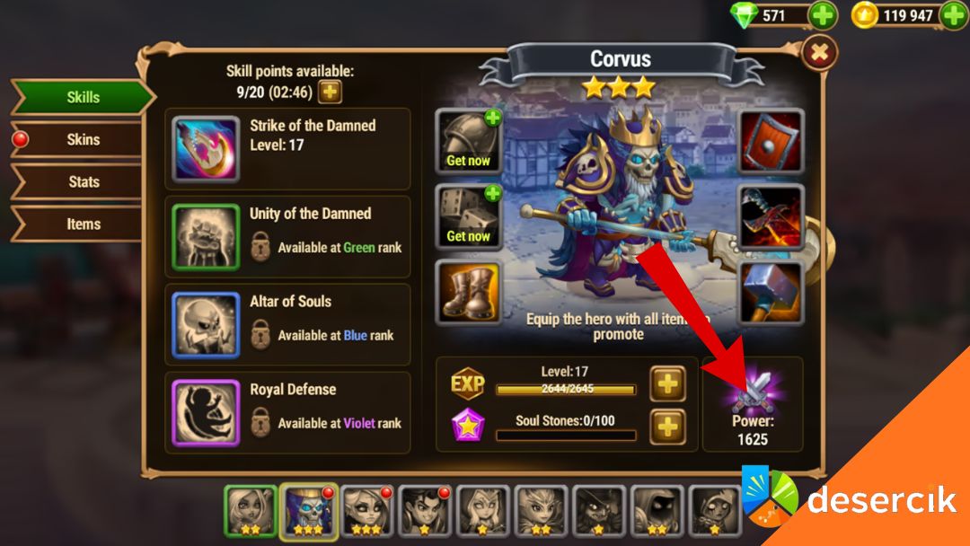 Aktualną moc bohatera znajdziesz w prawym dolnym rogu jego okna. To liczba, która pokazuje, jak bardzo rozwinięty jest dany bohater w tym momencie.