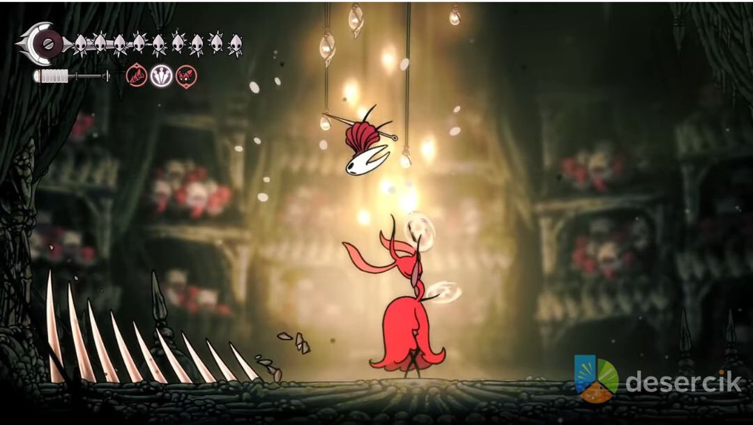 Bone Spikes – Karmelita skacze wysoko, po czym ląduje z impetem, uwalniając z sukni kolce kości. Wystarczy wypatrywać momentu, gdy zaczyna obracać się w powietrzu – to sygnał, że atak nadchodzi. Najlepiej wtedy odskoczyć lub wykorzystać Wings czy Swift Step.