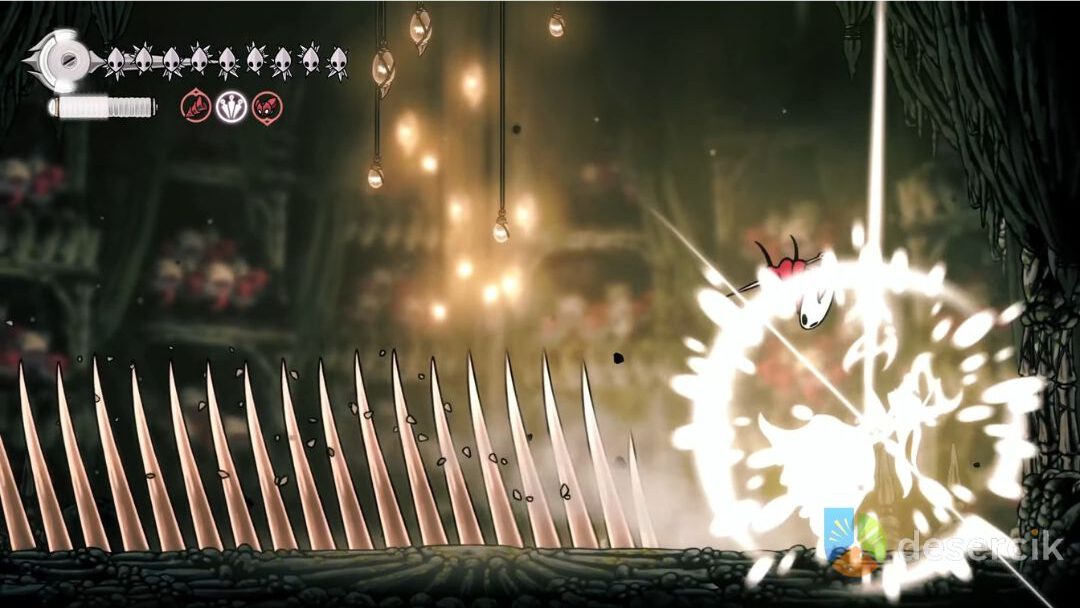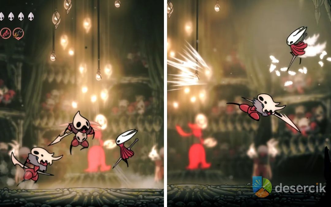 Sama walka nie rozpoczyna się od razu. Najpierw musimy przejść przez Ant Gauntlet – falę mrówczych przeciwników, przywoływanych przez pieśń Karmelity. W tym etapie stawiamy czoła głównie wrogom latającym, co zmusza do ciągłego ruchu i wykorzystywania mobilności Hornet. Co gorsza, jeżeli zginiemy na dowolnym etapie walki, trzeba ponownie pokonać całą tę falę przed ponownym podejściem do samej bosski.