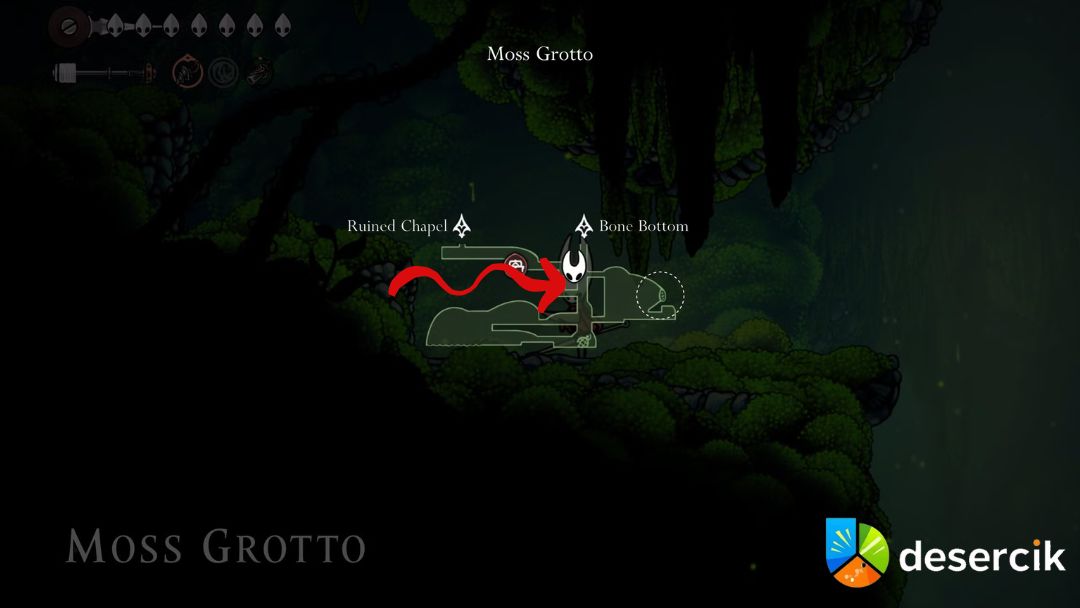Na środku obszaru znajduje się platforma, która teleportuje Hornet do dolnej części Weavenest Atla. Obok platformy zauważysz ścieżkę zablokowaną przewodami – po usunięciu przeszkody dotrzesz do komnaty Evy.