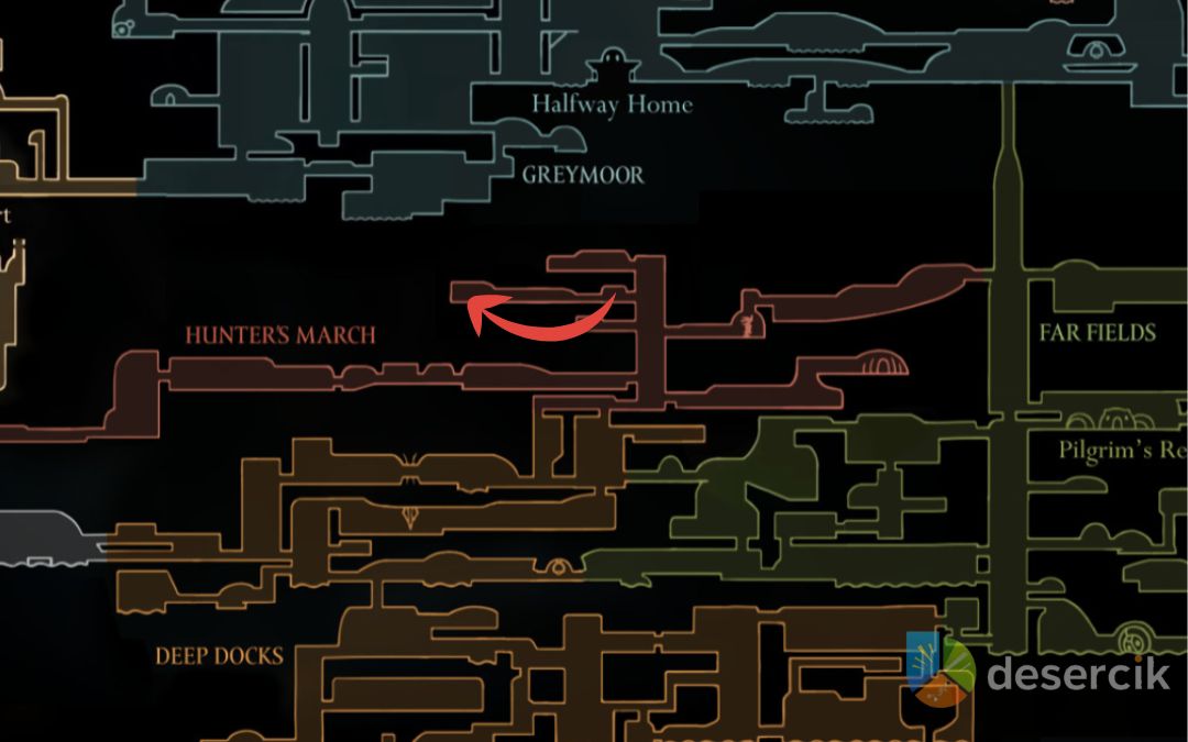 Aby dostać się do jego lokacji, najpierw musisz odblokować Drifter’s Cloak, wykonując misję Flexile Pines. Następnie możesz wykorzystać prąd powietrza w wskazanym miejscu na mapie Hunter’s March, który przeniesie Cię na szczyt wysokiej szybu. Na górnym poziomie znajdziesz wejście do pozornie pustego pokoju po lewej stronie.