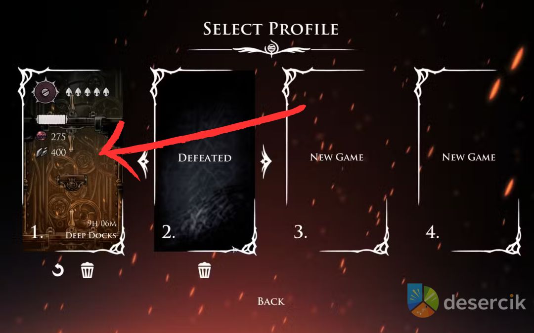 Po wybraniu Steel Soul Mode otrzymujesz jedno życie. Jeśli Hornet straci wszystkie punkty zdrowia, natychmiast pojawi się ekran Game Over, a zapis w wybranym slocie zostanie oznaczony jako „Defeated”. Jedyną opcją jest wówczas usunięcie tego zapisu, aby zrobić miejsce na nową próbę.