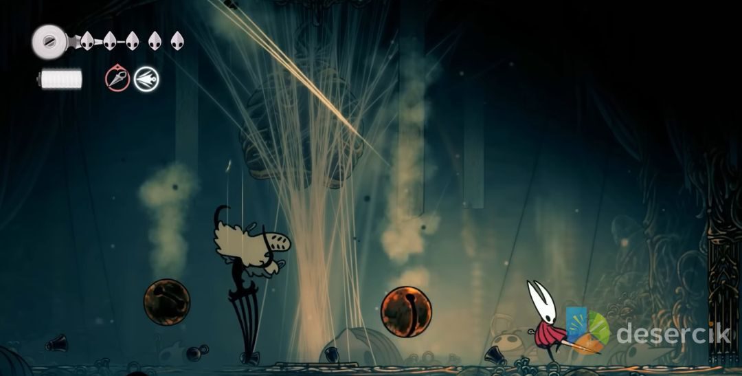 - Ground Spikes (kolce z ziemi) – The Widow przebiega po podłożu, a za nią wyrastają kolce. Zwracaj uwagę na złote nici, które zdradzają miejsce pojawienia się zagrożenia. Najlepiej unieś się w powietrze i użyj ataku z góry, aby odbić się od kolców.