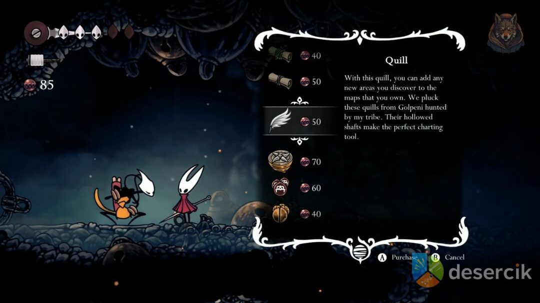 W oryginalnym Hollow Knight również trzeba było kupić pióro (Quill), aby uzupełniać mapy. Twórcy z Team Cherry celowo przenieśli ten mechanizm do Silksonga, bo stanowi on ważny element filozofii gry: eksploracja ma być nagrodą, ale też wyzwaniem, a narzędzia takie jak Quill sprawiają, że gracz samodzielnie „pisze historię” swojego odkrywania.