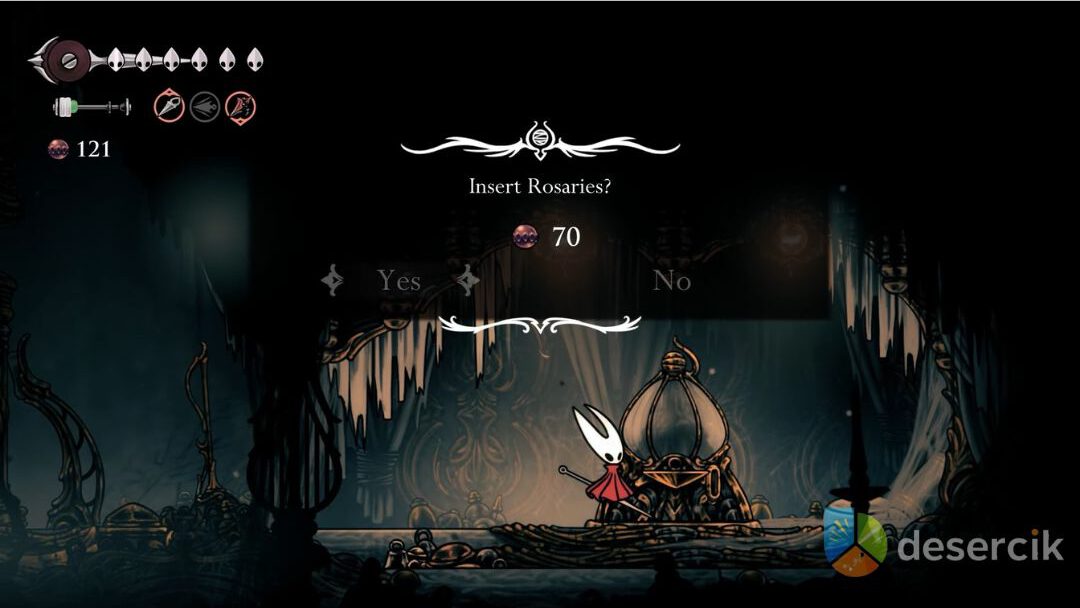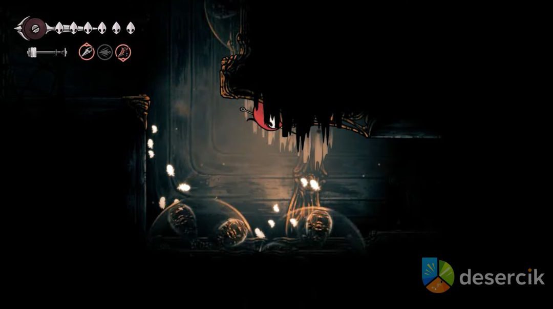 Podążając tą trasą, trafisz do obszaru wypełnionego parą wodną. Na jednej z platform znajdziesz zniszczalną ścianę po lewej stronie – rozbij ją, a odkryjesz kolejne, pozornie puste pomieszczenie. W rzeczywistości jednak kryje ono prawdziwy skarb. Wystarczy zniszczyć obiekt przyczepiony do sufitu, a z góry spadnie Rosary Cannon. Po zebraniu przedmiotu możesz udać się na ławkę i wyposażyć go w ekwipunku Hornet.