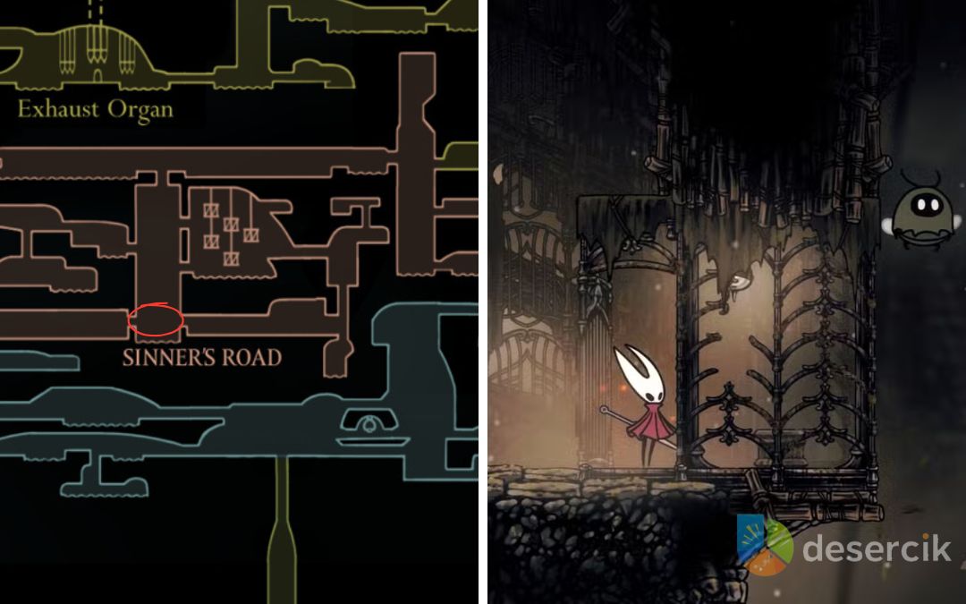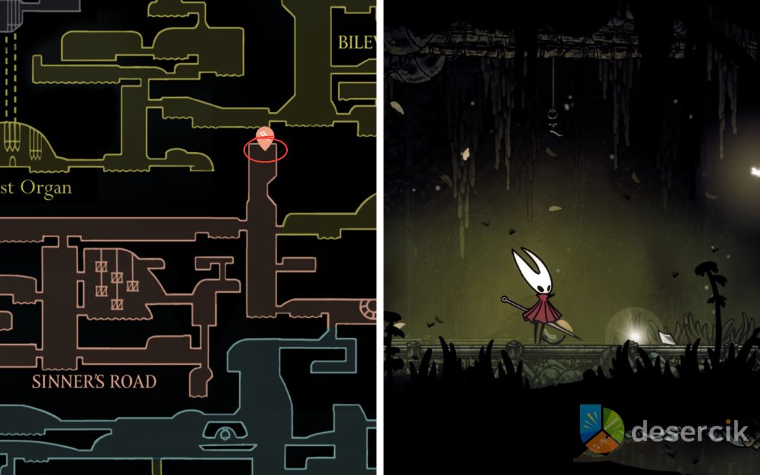 Trzeci klucz ukryty jest na Sinner’s Road. Aby do niego dotrzeć, będziesz potrzebował zdolności Cling Grip z Shellwood. Wspinając się po pełnym kolców szybie trafisz do małej areny, gdzie z góry spadnie potężny przeciwnik uzbrojony w ciężkie łańcuchy. Pokonanie tego minibossa nagrodzi Cię kluczem prostym. To wymagająca potyczka, ale satysfakcja i nagroda są tego warte.