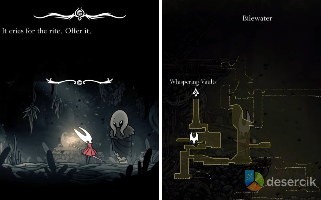 Wejście do Bilewater kryje się za sekretami w Whispering Vaults. W pierwszej sali z zagadkowymi skrzyniami trzeba uderzyć w ścianę po prawej stronie, blisko sufitu, aby odkryć ukryte przejście. Dalej droga prowadzi w dół, aż w końcu trafiamy do samego Bilewater – terenu pełnego toksycznych wód i nieprzyjaznych stworzeń.