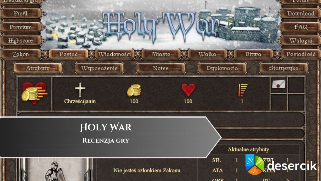 Całość bardzo szybko zaczyna przypominać klasyczny grind. Rozwijamy postać po to, by atakować, atakujemy, żeby zdobywać złoto, a złoto wydajemy na dalszy rozwój. Ten schemat powtarza się bez końca. Trzeba jednak pamiętać, że mówimy o starej grze przeglądarkowej, więc takie rozwiązania były kiedyś standardem. To, co wyróżnia Holy War na tle setek podobnych tytułów, to właśnie specyficzny klimat i możliwość wcielenia się w najeźdźcę z czasów krucjat.