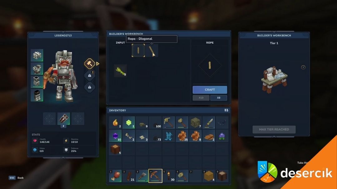 Na ten moment, czyli we wczesnym dostępie, linę można wytwarzać wyłącznie przy Builder’s Workbench. To właśnie tam powstają wszystkie elementy związane z budowaniem i eksploracją. Sama receptura jest bardzo prosta i nie wymaga żadnych rzadkich materiałów.