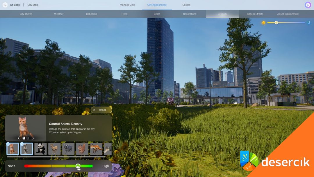 Po wybraniu gatunków i ustawieniu intensywności klikasz Go Back, a zwierzaki zaczną powoli pojawiać się w parkach, na skwerach, w zaułkach, a czasem nawet w miejscach, gdzie zupełnie się ich nie spodziewasz. To drobny detal, ale naprawdę ożywia całe miasto.