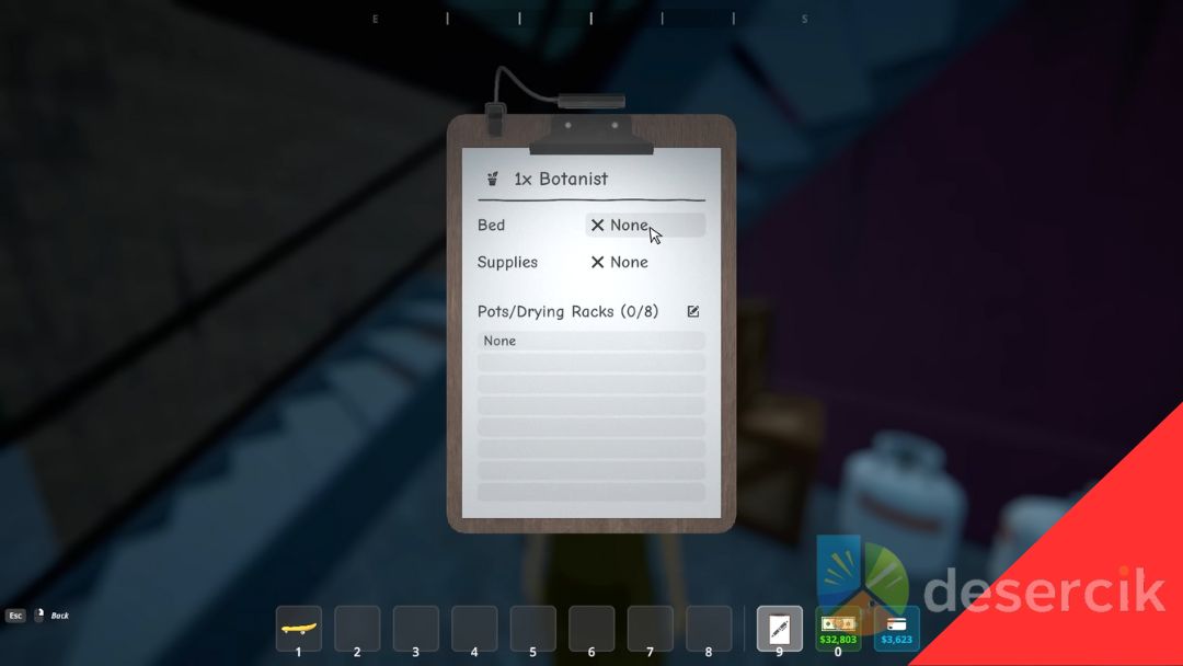 Botanik to osoba odpowiedzialna za sadzenie i zbieranie roślin – zarówno marihuany, jak i koki. Twoim zadaniem jest przypisać go do grow boxów i półek, na których będą przechowywane potrzebne materiały, a następnie skonfigurować go w Management Clipboard i przypisać mu łóżko.