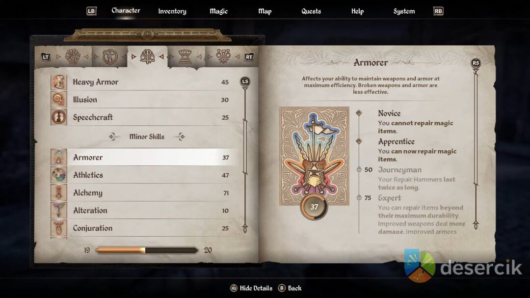 Umiejętność Zbrojmistrz kontroluje, jak skutecznie gracz może naprawiać przedmioty. Na niskim poziomie: