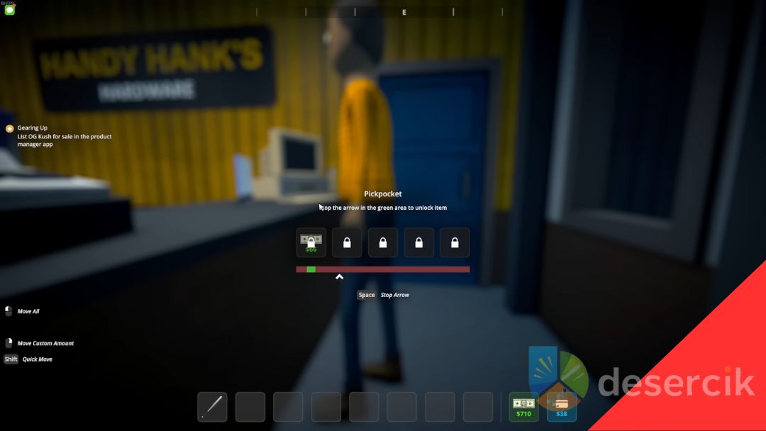 Gdy już jesteś blisko i ukryty, naciśnij E – to startuje mini‑grę. Na ekranie pojawi się pasek ze wskaźnikiem, który musisz zatrzymać w zielonej strefie. Robisz to za pomocą spacji. Im cenniejszy przedmiot, tym mniejsza zielona strefa i trudniejsza precyzja.