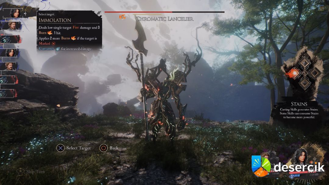 Podczas walki u góry ekranu pojawia się komunikat informujący, jaki typ ataku wykonuje Chromatyczny Lancelier, co jest kluczowe, żeby wiedzieć, kiedy parować lub unikać. Pamiętaj, że wczesna gra jest bezlitosna – jeden błąd może oznaczać natychmiastowe zabicie postaci.