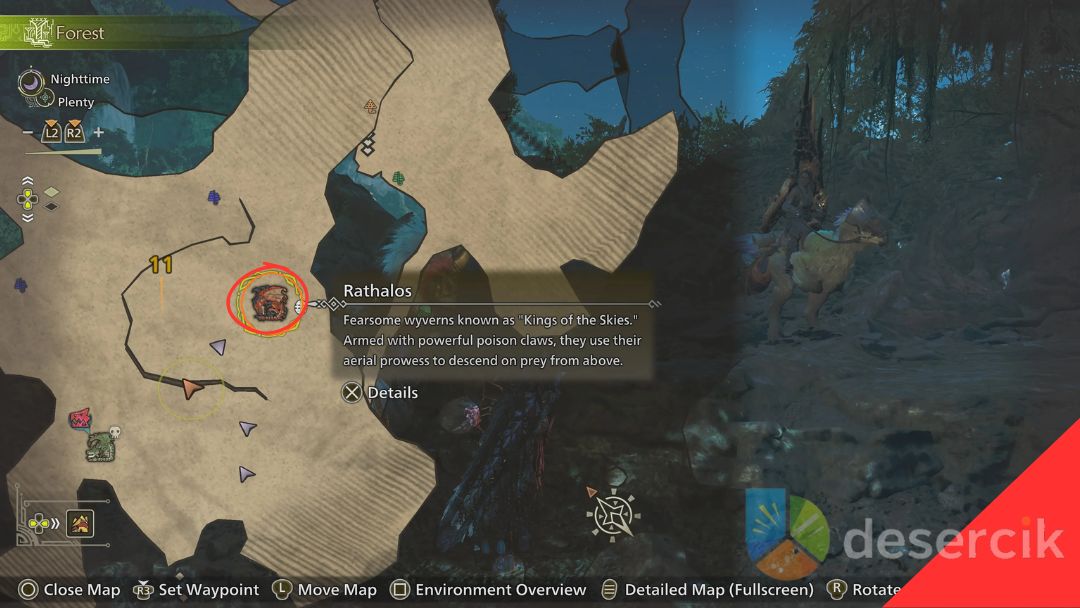 Na mapie świata przesuń kursorem nad ikonami regionów i sprawdź listę aktywnych potworów. Jeśli zobaczysz Rathalosa, najlepiej przenieś się do najbliższego obozu, uzupełnij zapasy i ustaw punkt docelowy na ikonę potwora.