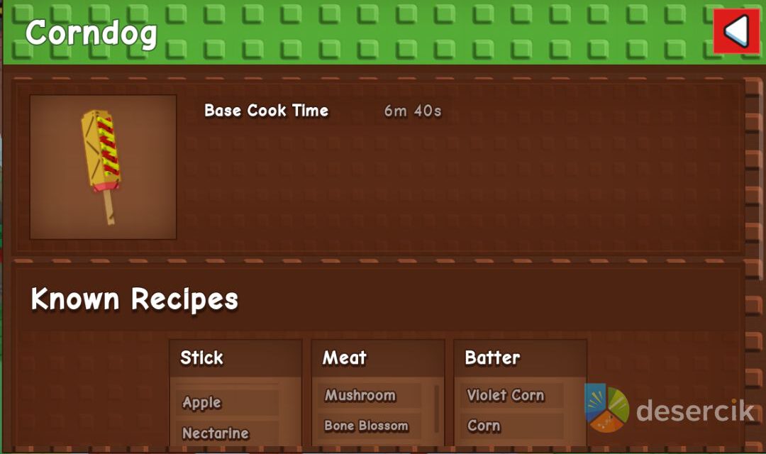 Opis: Ten przepis jest podstawowy i najłatwiejszy do wykonania, idealny dla początkujących graczy. Gotowy corndog nadaje się do craftingu standardowego Pet Pouch.