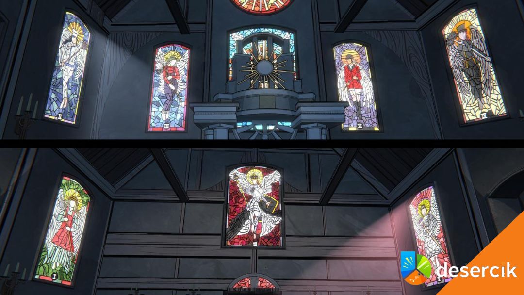 Rozwiązanie zagadki z Grobowca znajdziesz w Kaplicy. To tam, na ścianach, znajdują się witraże przedstawiające te same postacie, które widzisz w Grobowcu. Pod każdym witrażem umieszczony jest numer. Te liczby nie są dekoracją – pokazują dokładną kolejność interakcji z posągami.