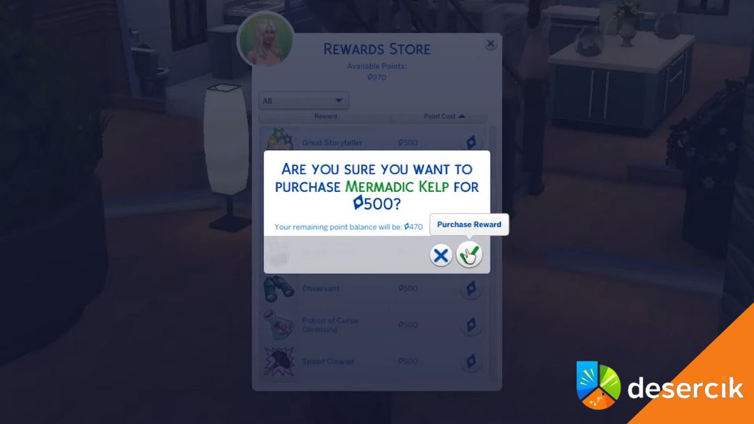 - Jedzenie Mermadic Kelp – roślina ta jest kluczem do przemiany w Syrenę i można ją zdobyć na kilka sposobów: łowiąc ryby, nurkując po skarby, prosząc delfina o przyniesienie skarbu lub eksplorując jaskinię w Mua Pel’am. Najłatwiej kupić ją w Rewards Store za 500 punktów satysfakcji albo użyć cheatów.
