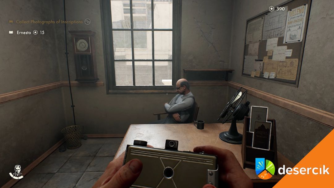 Ernesto to charakterystyczna postać – siedzi w biurze i handluje nie tylko sprzętem fotograficznym. Warto od razu zrobić mu zdjęcie – to zabawna interakcja, a przy okazji łatwy sposób na zdobycie osiągnięcia.