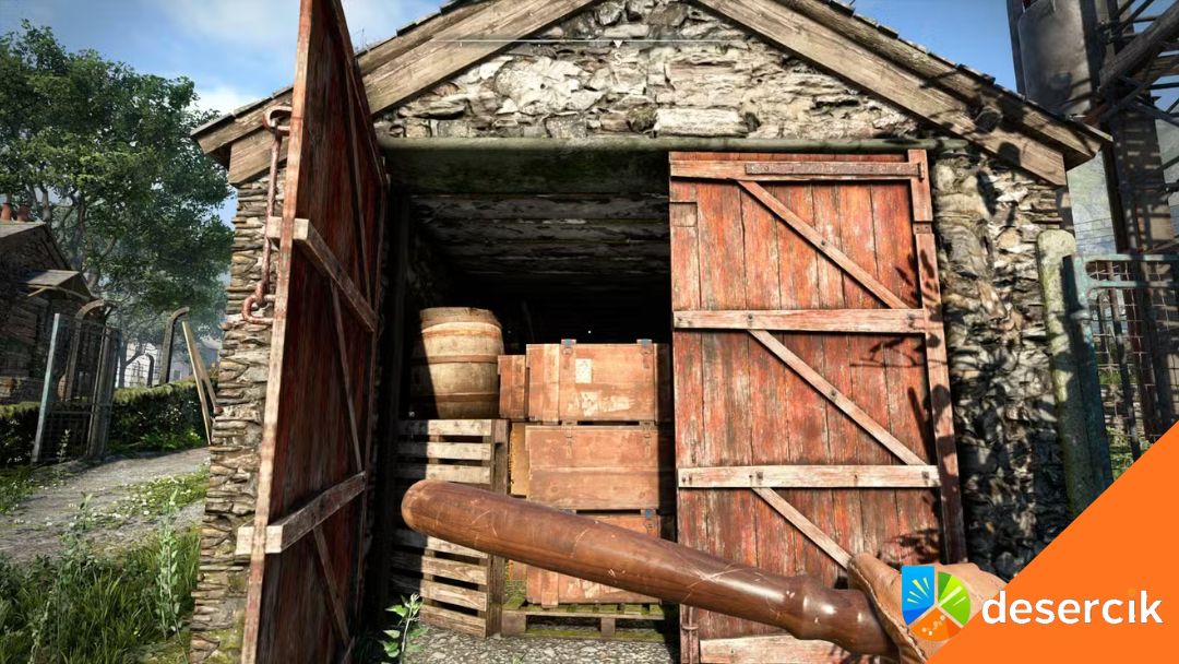 Zamiast tego obejdź cały teren i podejdź od tyłu. Znajdziesz tam niewielzą szopę z wyrwą w ścianie. Wskakujesz na skrzynie w środku, przeciskasz się pod drzwiami i trafiasz na dwóch strażników, którzy kręcą się tam w kółko.