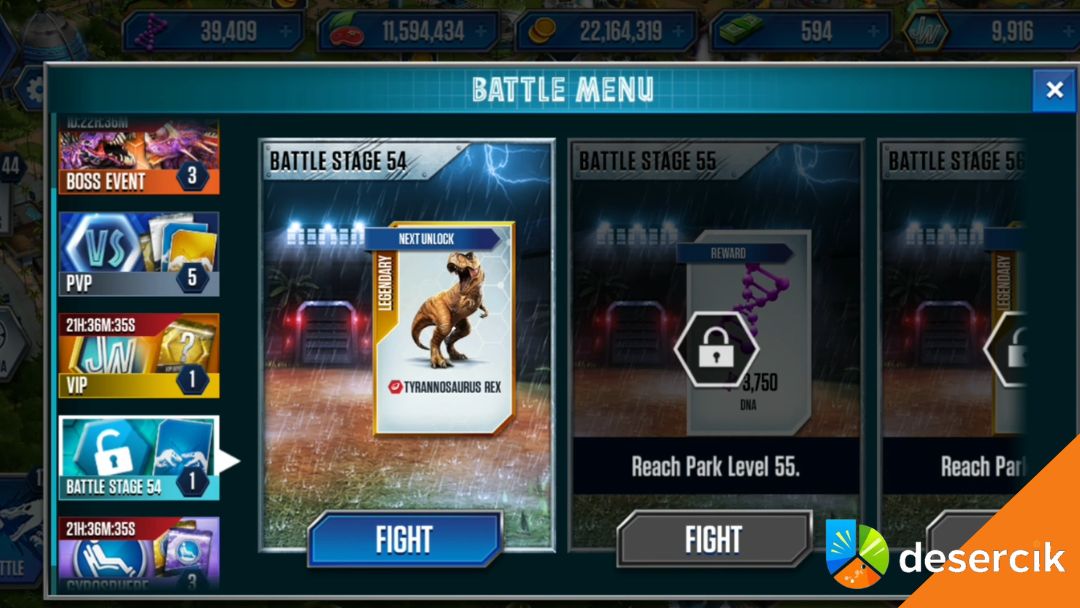 W sekcji wydarzeń pojawiają się różne wyzwania – od prostych bitew po trudniejsze serie walk. W niektórych z nich nagrodą może być właśnie T-Rex albo jego DNA.