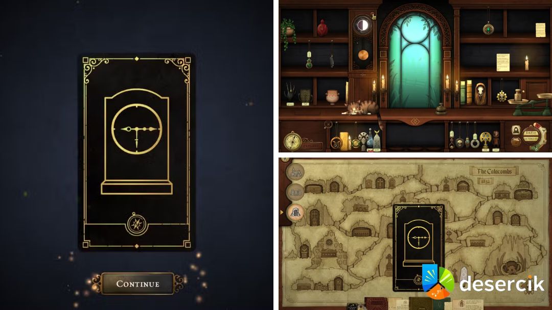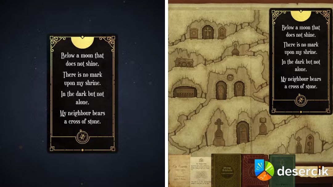 Na obrazku widzimy grób z zegarem, ale takiego w katakumbach nie ma. Rozwiązanie tkwi w zegarze wewnątrz gry – trzeba ustawić go zgodnie z kartą i powiązać ze stanem księżyca. Odpowiedni grób znajdziesz dopiero wtedy.