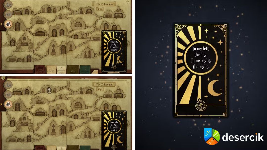 Zagadkę stanowią dwie frazy: „po lewej dzień” i „po prawej noc”. To jasna wskazówka – obok miejsca ukrycia musi być kamień ze słońcem po lewej i z księżycem po prawej. Znajdziesz je na pierwszym poziomie katakumb.