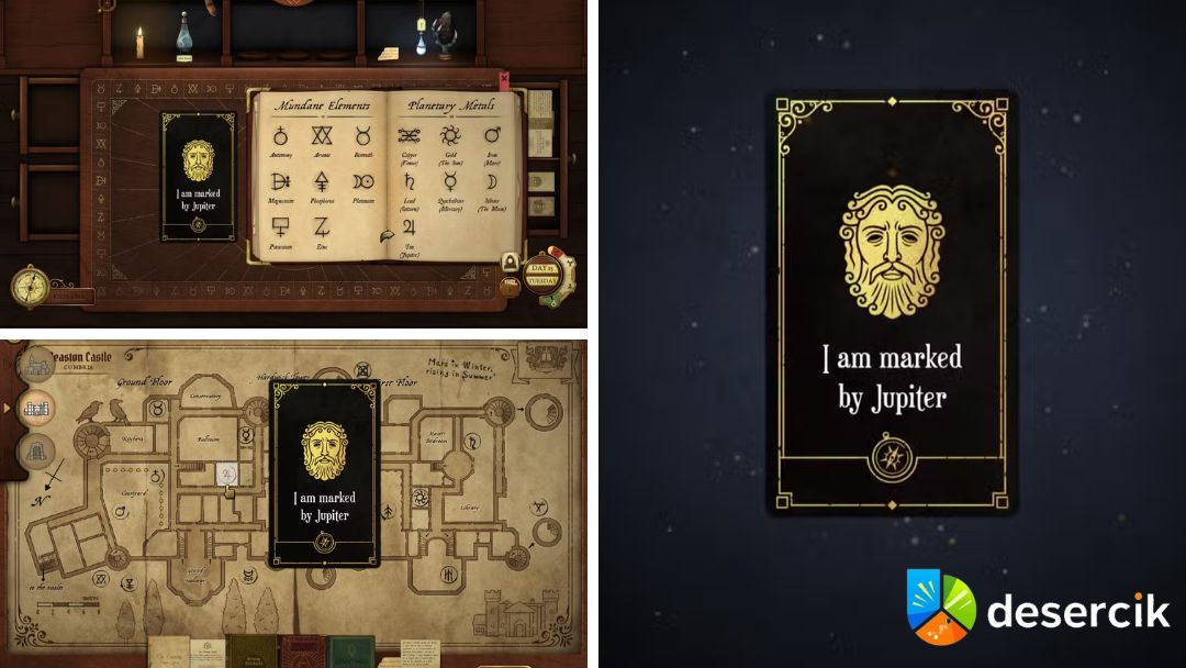 Tym razem karta jest bardzo krótka: „oznaczony przez Jowisza”. Z pomocą przychodzi księga symboli – Jowisz to znak cyny. Pokój z tym symbolem znajdziesz na parterze zamku.