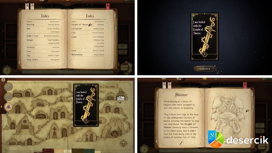 „Pochowany z Rycerzem Cierni” – tu trzeba zajrzeć do indeksu i opisu antyku Shimmer. Rycerz zginął w roku 1356, a w katakumbach znajdziesz grób z cierniami i tą właśnie datą.