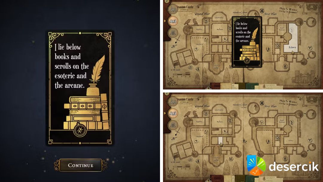 Ostatnia karta prowadzi nas do biblioteki. Tekst mówi: „leżę pod książkami i zwojami”. Oznacza to, że trzeba dopasować plan biblioteki do parteru i sprawdzić prawą stronę. Odpowiedni pokój to drugi od lewej, tuż za wielką halą.Clue Cards w Strange Antiquities to jeden z najciekawszych elementów gry – łączą klimat łamigłówki, eksploracji i historii w jeden system. Dzięki nim każda lokacja nabiera drugiego dna, a poszukiwanie antyków nie jest tylko mechaniką zbieractwa, lecz pełnoprawną przygodą, w której liczy się spostrzegawczość i umiejętność czytania między wierszami.