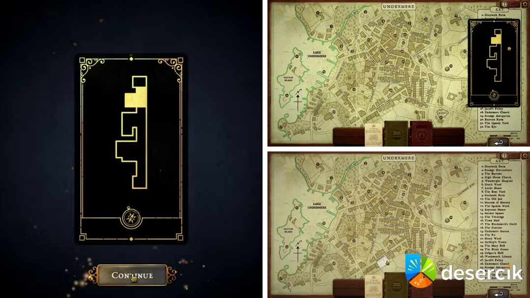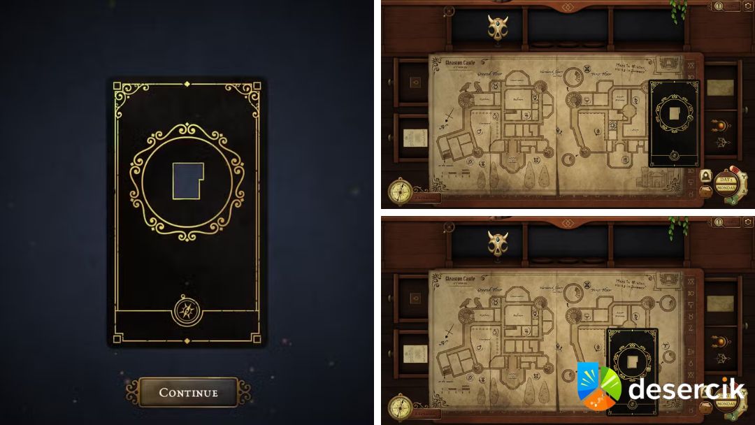 Przenosimy się na nową mapę – majestatyczny zamek Gleaston. Karta wygląda jak fragment wnętrza i tak naprawdę pasuje do jednego z pokoi na parterze. Wystarczy porównać kształt wycięcia z planem zamku, by znaleźć właściwą lokalizację.