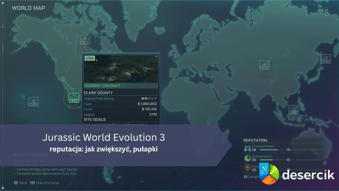 Podczas kampanii natrafisz na r贸偶ne pu艂apki reputacyjne, wi臋c warto ca艂y czas pilnowa膰 kontrakt贸w i zwi臋ksza膰 swoje punkty w tle, nawet gdy rozwijasz park. Ale uwaga – poziomy reputacji maj膮 swoje limity, kt贸re odblokowujesz dopiero, gdy rozbudowujesz kolejne tereny i powi臋kszasz swoj膮 dinozaurz膮 pot臋g臋.