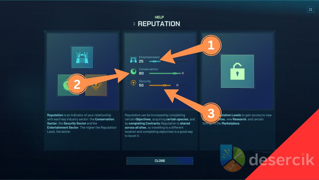 Najprostszy spos贸b, 偶eby podnie艣膰 reputacj臋, to realizowanie kontrakt贸w – dodatkowych misji pobocznych, kt贸re daj膮 zar贸wno kas臋, jak i punkty reputacji w jednym z sektor贸w. Warto zwraca膰 uwag臋 na ikonki przy ka偶dym kontrakcie: pomara艅czowa oznacza Bezpiecze艅stwo (3), niebieska Rozrywk臋 (1), a zielona Ochron臋 Przyrody (2). Nie ma limitu liczby kontrakt贸w, wi臋c spokojnie mo偶esz klepa膰 najprostsze w k贸艂ko, 偶eby maksowa膰 swoje punkty.