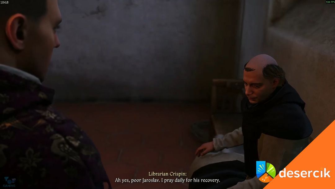 Mnich Celestyn jest w głównej sali kościoła. Jeśli wcześniej sprawdziłeś rzeczy Jaroslava, pojawi się dodatkowa linia dialogowa, w której Celestyn ujawnia, że Jaroslav nocą wchodził do piwnicy, prawdopodobnie spotykając się z kimś w tajemnicy. Jeśli nie sprawdziłeś jego rzeczy.