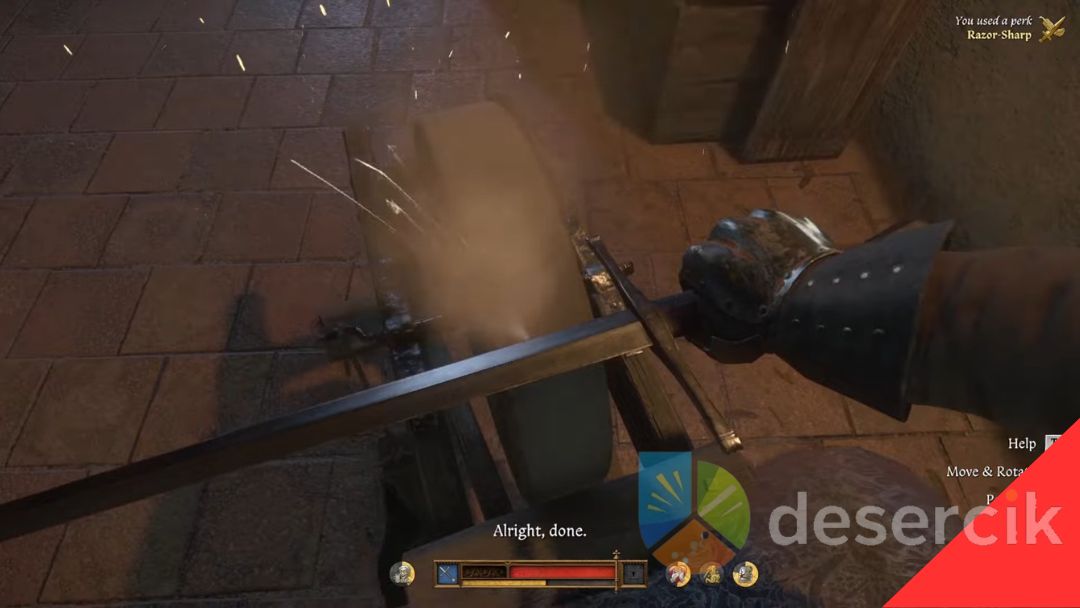 Wejdź do kowala lub warsztatu ostrzarskiego, połóż miecz na kamieniu i ustaw go w taki sposób, by pojawił się czarny dym – to znak, że narzędzie jest źle ustawione. Teraz rozpocznij ostrzenie. Kiedy Henryk powie, że ostrze jest już „brzytwowo ostre”, nie przerywaj – zacznij proces od nowa. I rób to w kółko.
