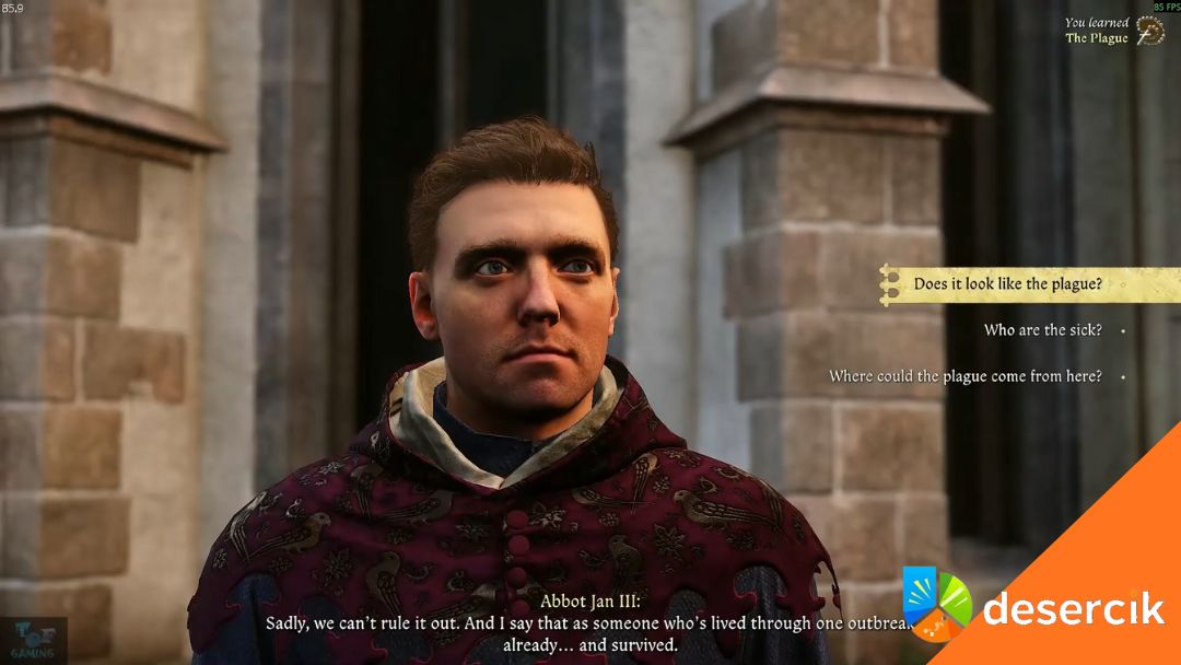 „Does it look like the plague?” → „I’m sorry” (Reputation+) → „Who are the sick?” → „How could they all have got infected?” (24 Scholarship, Reputation+) → „What now, Albik?” → „Alright”