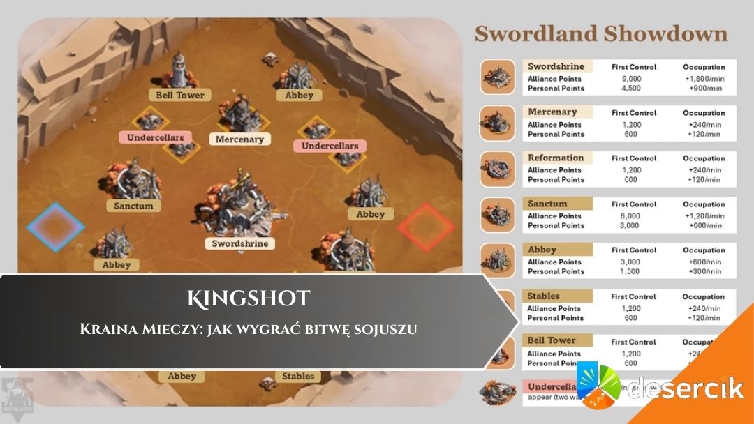 Kraina Mieczy to najważniejsze starcie sojusz kontra sojusz w grze Kingshot. Przez pełną godzinę dwie zarejestrowane Legie trafiają na specjalną mapę wypełnioną punktami do przejęcia, budowlami z bonusami i zmieniającymi się celami. To nie jest zwykła bójka – bardziej przypomina kontrolę mapy w strategii czasu rzeczywistego.