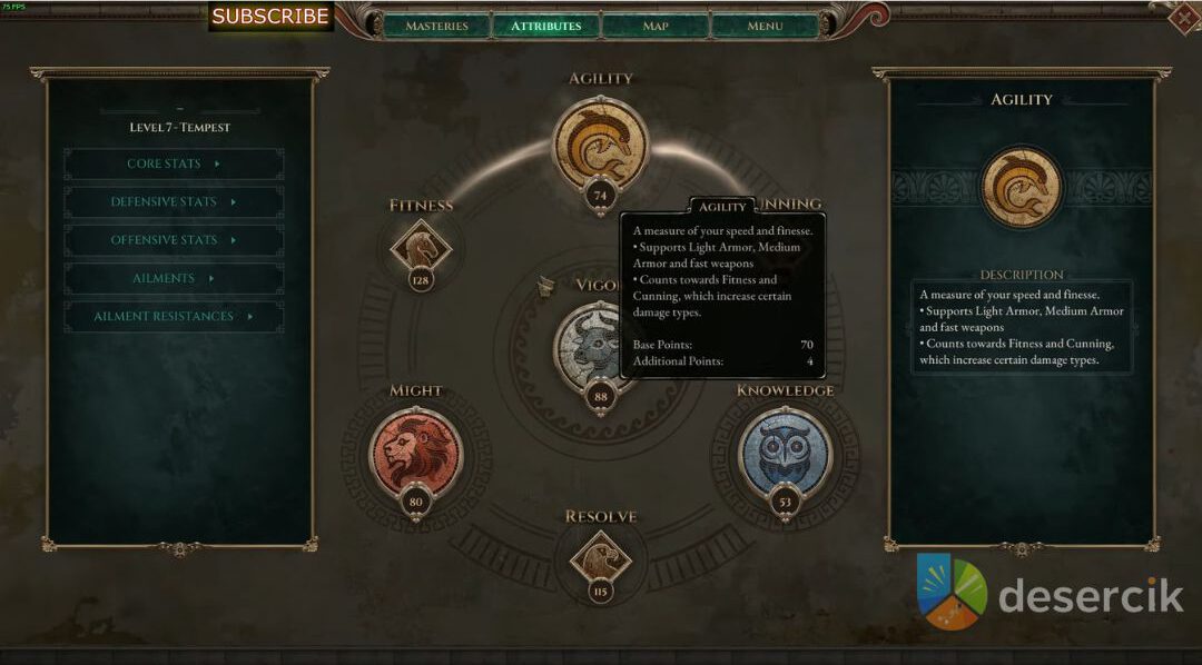 Każdy poziom postaci pozwala rozdzielić punkty na cztery główne atrybuty: Zręczność, Wiedza, Siła i Witalność. Każdy z nich wzmacnia postać w inny sposób: