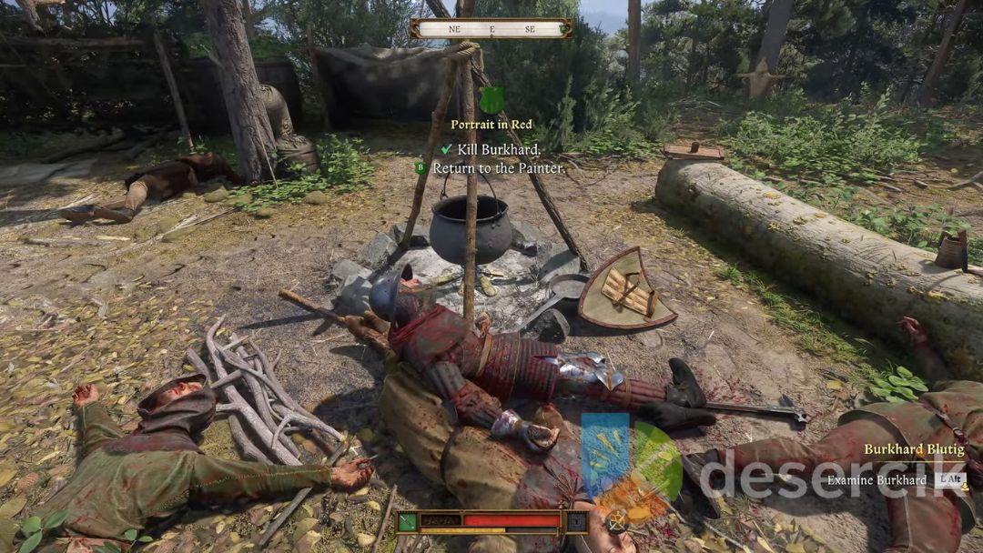 Niezależnie od tego, którą drogę wybierzesz, koniecznie przeszukaj ciało Burcharda. Znajdziesz przy nim klucz do skrzyni stojącej obok ogniska w centrum obozu.