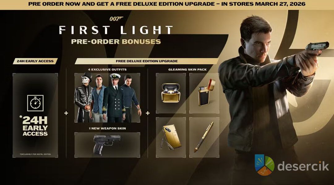 Każdy, kto zdecyduje się na zakup przed premierą, dostaje darmowy Deluxe Upgrade. W pakiecie są cztery stroje – Day of the Dead, Desert Explorer, Silent Anchor i Gentleman Operator – plus skórka dla broni (Agent’s Mark) i tzw. Gleaming Pack, czyli złociste gadżety Bonda (zapalniczka, słuchawki, pistolet na strzałki i długopis). Do tego cyfrowe preorderowe wersje Standard Edition dadzą dostęp do gry 24 godziny wcześniej.